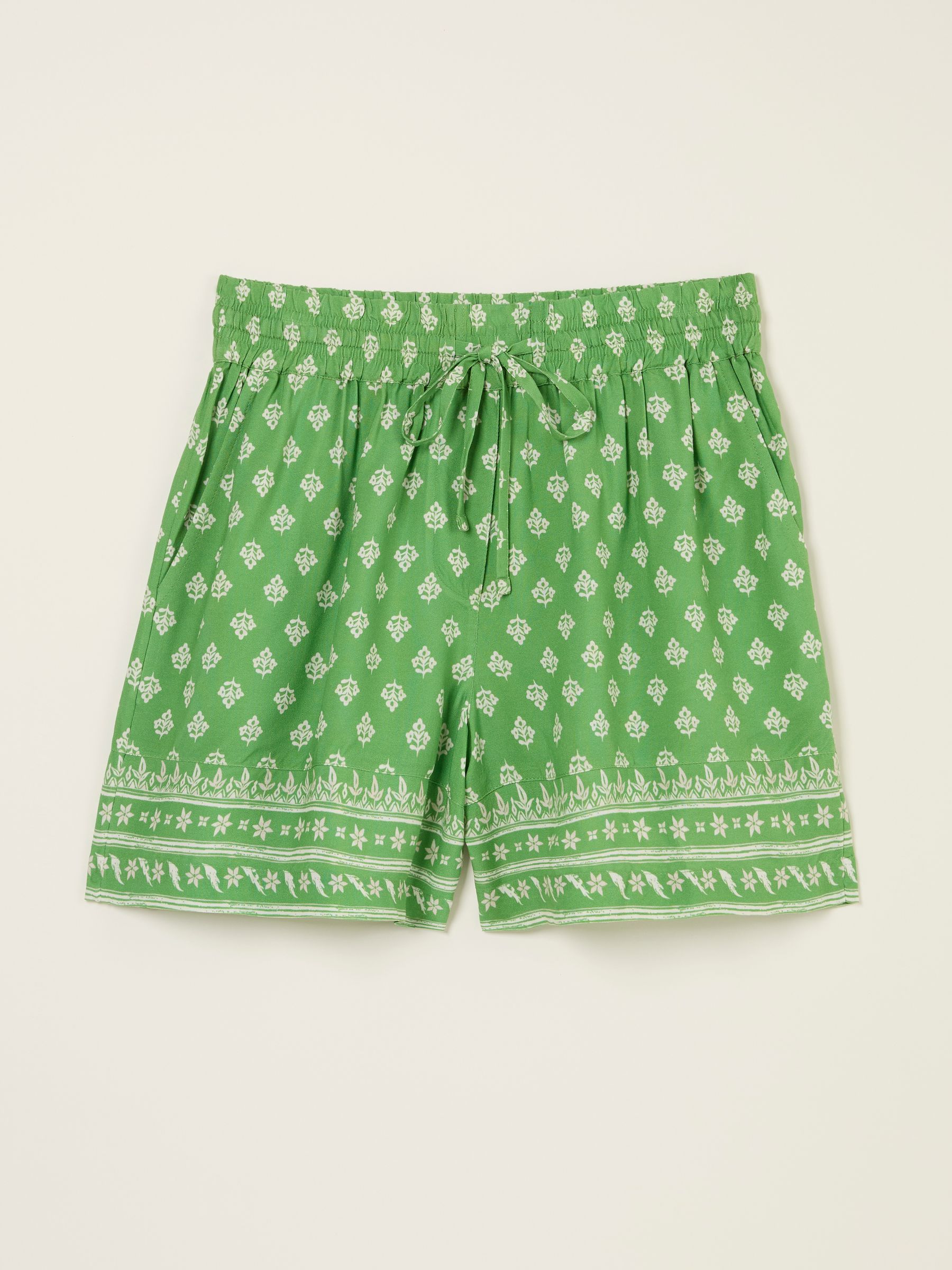 Our flippy shorts are the ultimate summer essential, whether you need a lightweight bikini cover-up or a stylish pair for dinner and drinks on vacation. Crafted from soft, breathable 100% LENZING™ ECOVERO™ Viscose, these shorts feature a drawstring and shirred waist for a comfortable, adjustable fit. With their loose silhouette and vibrant shell print, they’re the perfect choice for sunny beach days.Model is 5’9”/175cm and wears UK size 8Regular inside leg length 4.5" / 12cm.
